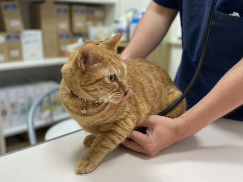 飼い主様に症状や発症時期等を伺い、その情報を元に必要な検査内容をご相談します。また、一般的な身体検査(視診・聴診・触診)を実施し、粘膜色や心雑音・呼吸音の確認、心疾患以外の問題がないかを確認します。